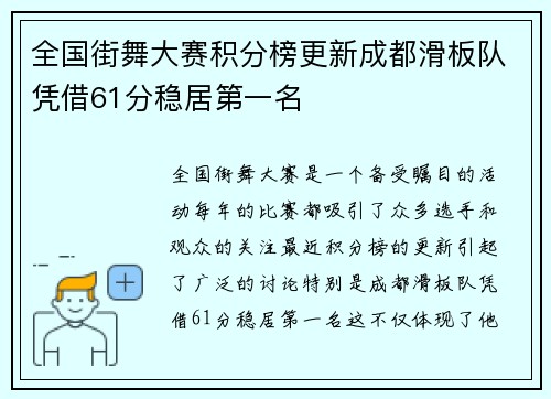 本文将对北京滑板队在极限运动世界杯中的力量表现与技术进行深入分析。首先,我们将探讨滑板运动员的身体素质和力量训练,进一步分析他们在赛事中的技术应用及其相互影响。接着,我们将研究团队的协作和心理素质如何提升整体表现。同时还会关注滑板队的战术选择与应变能力,以及如何在激烈竞争中保持优势。通过这些方面的详细阐述,我们希望为读者提供全面而深入的洞见,让大家更好地理解北京滑板队在国际舞台上的卓越表现。 1...
